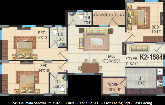 Electricals | Wiring concealed with fire resistant wires. Provision for split AC in all bedrooms. Adequate points for lights, fans & other plugs in bedrooms, toilets and kitchen with modular switches of reputed brand. Exhaust fans & geysers points in toilets and kitchen. Plug points for chimney, water purifier, refrigerator & other kitchen appliances in kitchen. TV points in living & Master bedrooms. Telephone points in living & master bedrooms. |