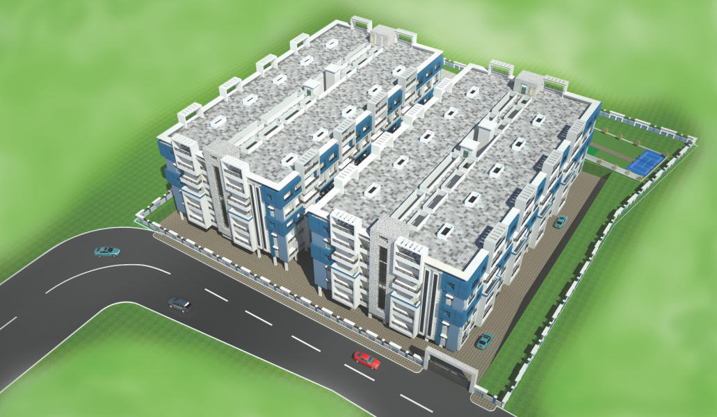 Swimming pool with kids pool. Children's play area Pylon. Pool side club house. Entrance lobby. Tennis court. Pathway and jogging track.