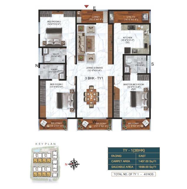 3 BHK Type-1 Floor Plan